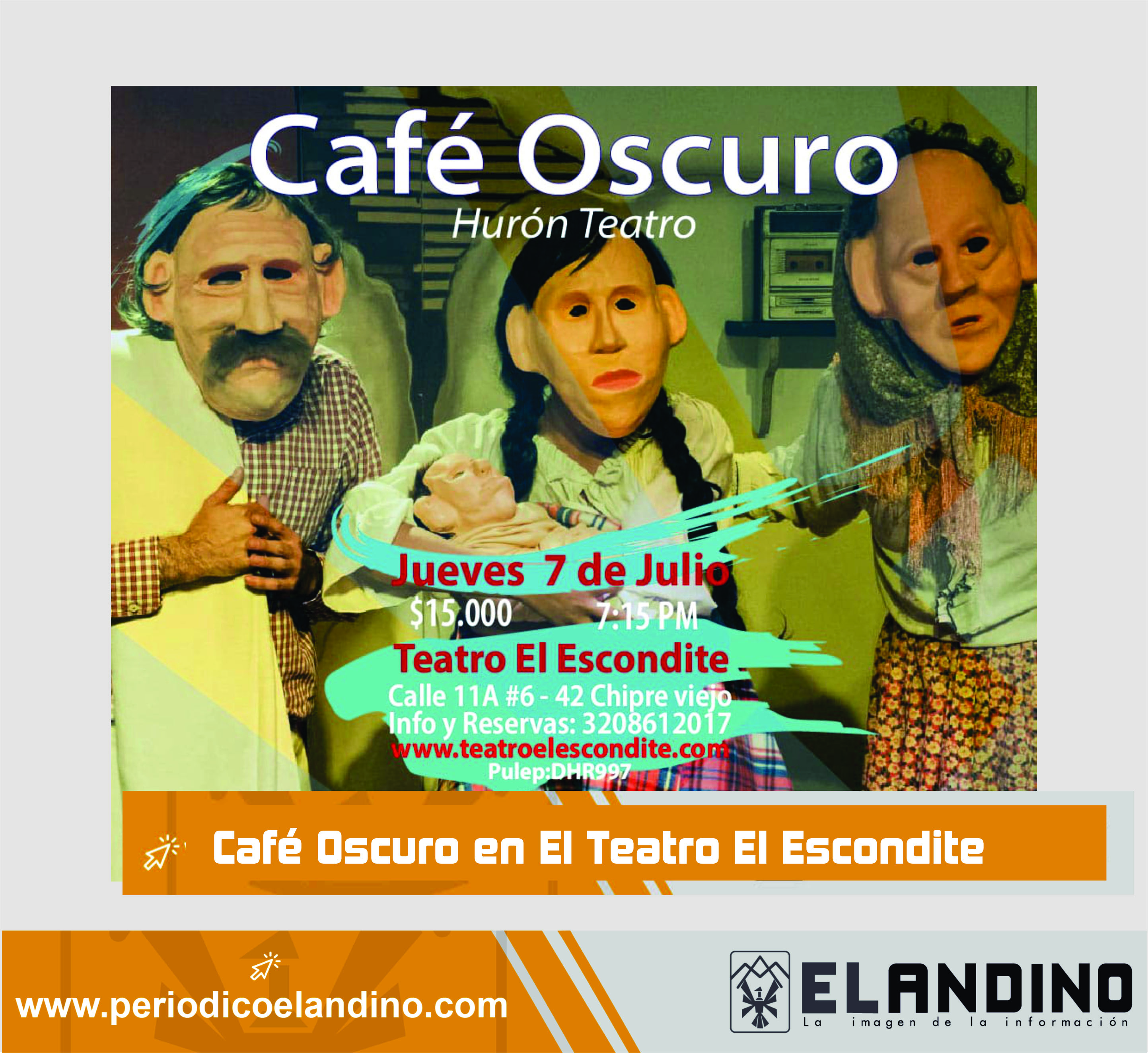 Llega a la Sala de Teatro El Escondite la compañía Hurón Teatro con su obra CAFÉ OSCURO. Un muy buen trabajo actoral, plástico y dramatúrgico, tan exquisito como un CAFÉ OSCURO, el próximo jueves 7 de julio a partir de las 7:15 p.m.