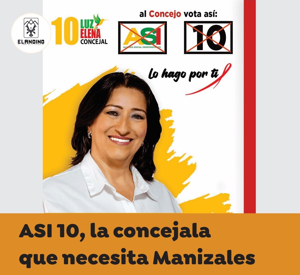 Luz Elena García Gómez quien va por el Concejo de Manizales, con el Aval de ASI con el número 10, es graduada en Administración Financiera con especialización en Negocios Internacionales, lleva más actuaciones en empresas privadas, que, en otros ámbitos, en el campo de mercadeo y Comercio Internacional en empresas como Descafecol, Madeal, Progel, Iderna, donde llegó a ser gerente. Es una mujer emprendedora y empresaria con negocios propios tal como el restaurante bar “La Rockola”.