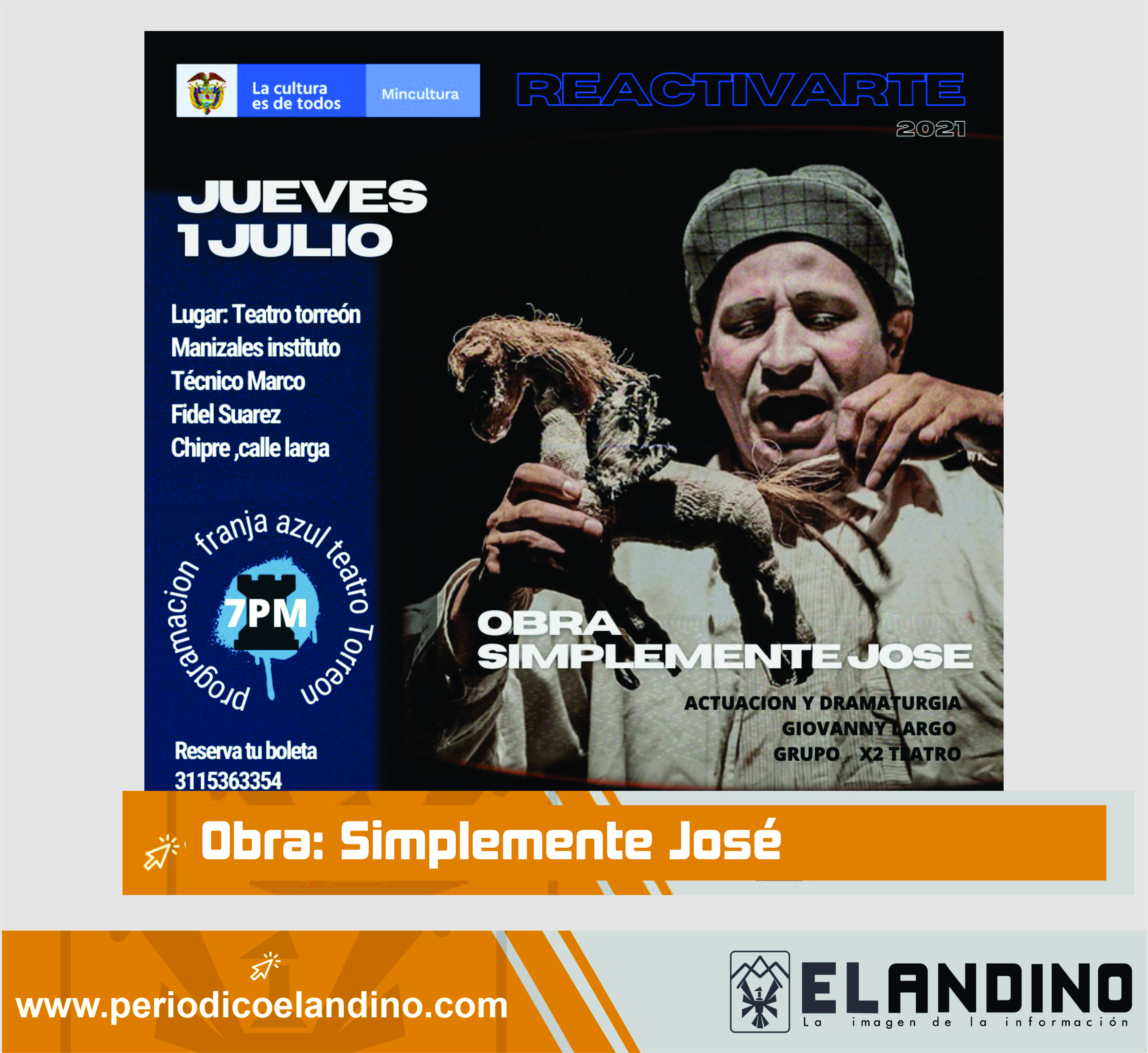 Este jueves 1 de julio a las 7 p.m. en el Teatro Torreón del Instituto Técnico Marco Fidel Suarez (Chipre, Calle larga), será la obra "Simplemente José" con la actuación y dramaturgia de Giovanny Largo, Grupo X2 Teatro. Reservas: Aporte voluntario (cupo limitado) en el 311 536 3354 - 314 512 2675.