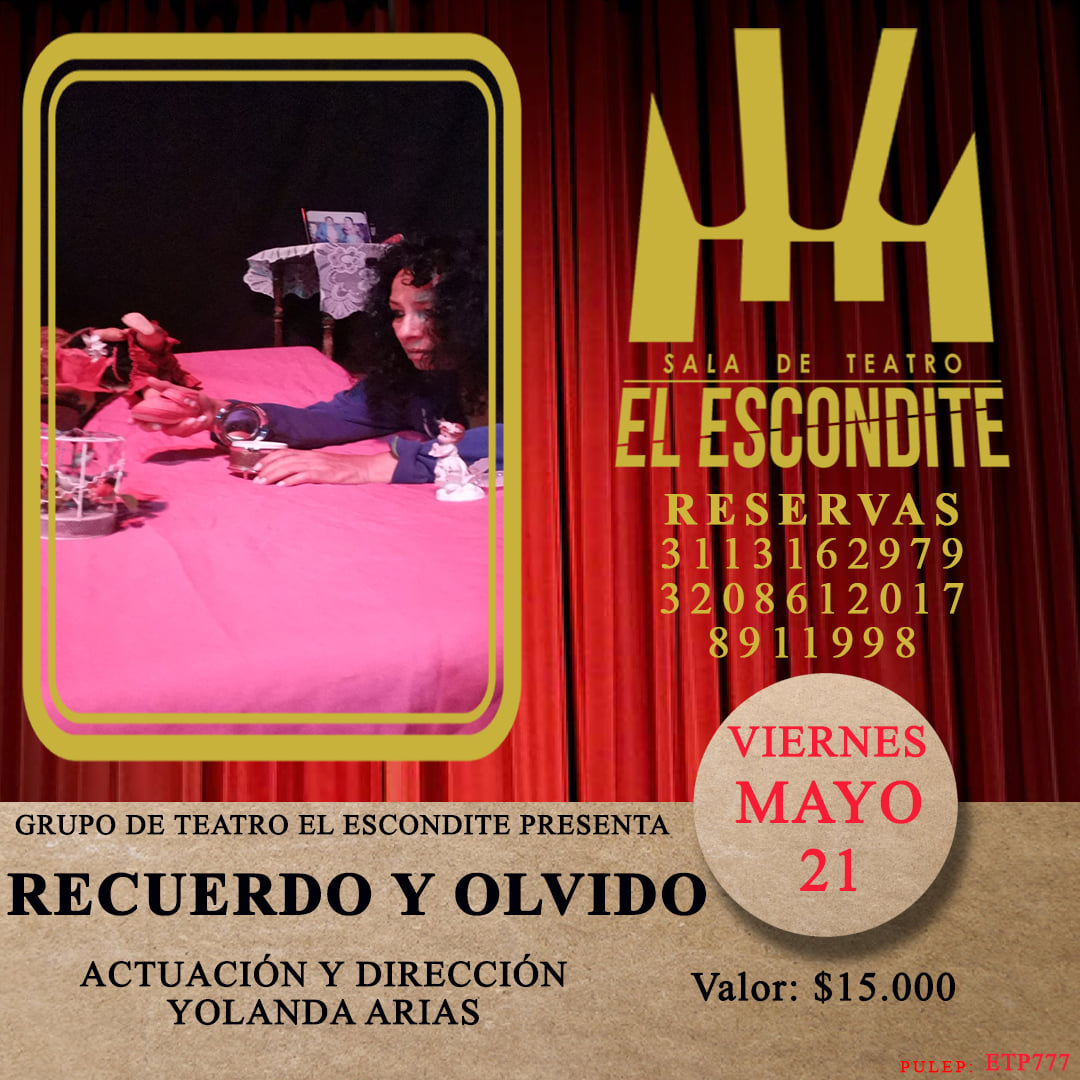 Recuerdo y Olvido de manera presencial en el Teatro El Escondite. Este viernes 21 de mayo a partir de las 7 p.m. Entrada Limitada. Venta de boletería: 8911998 – 3113162979. Boletería $15.000. Dirección y actuación: Yolanda Arias Gómez. (Función presencial Aplicando las normas de Bioseguridad decretadas por MinSalud)