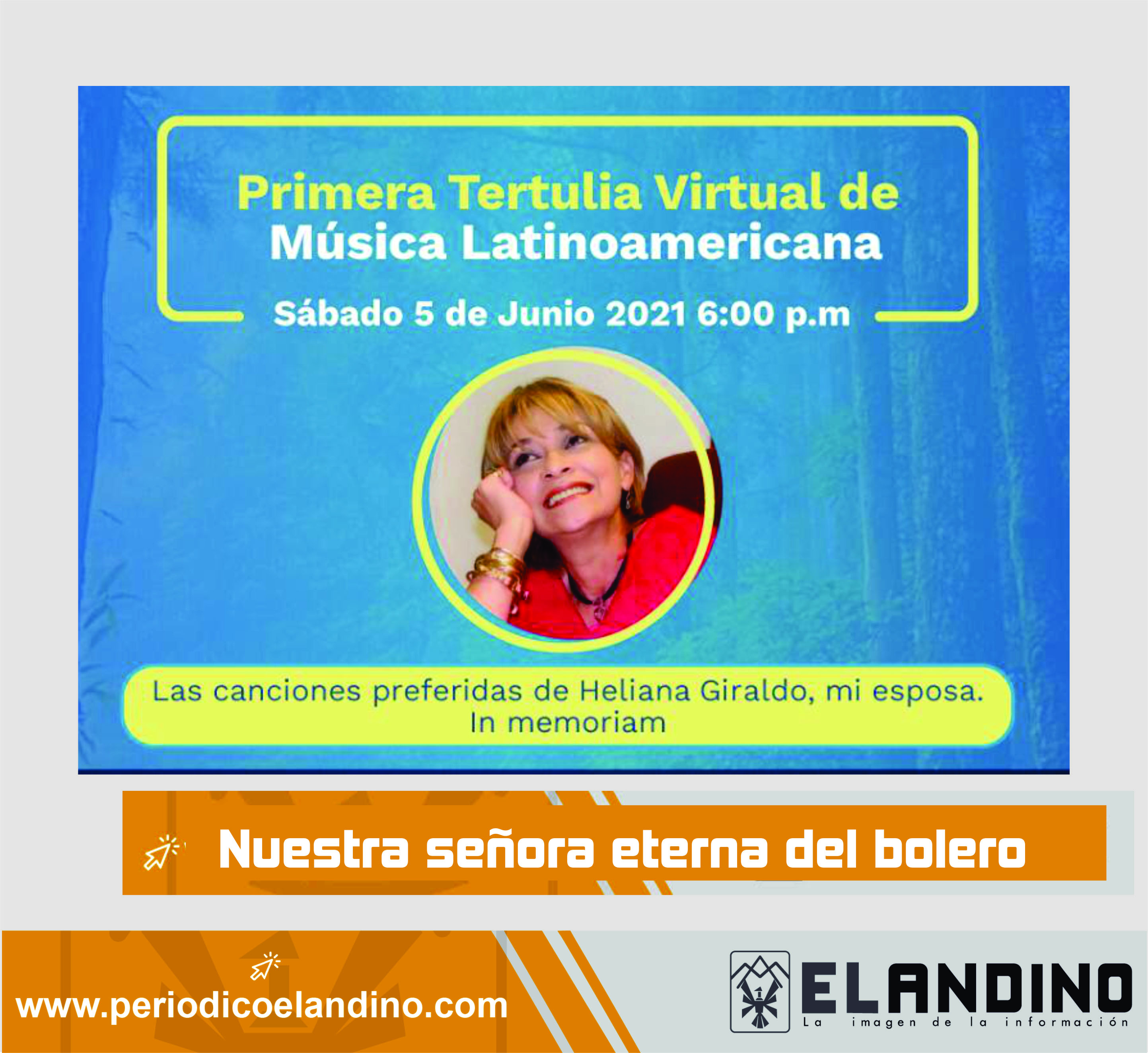 Este sábado 5 de junio a partir de las 6 p.m. será la Primer Tertulia Virtual de Música Latinoamericana, "Las canciones preferidas de Heliana Giraldo Hurtado, In Memoriam". "Nuestra Señora Eterna del Bolero". Transmisión que será por el Facebook de la Secretaría de Cultura de Caldas.