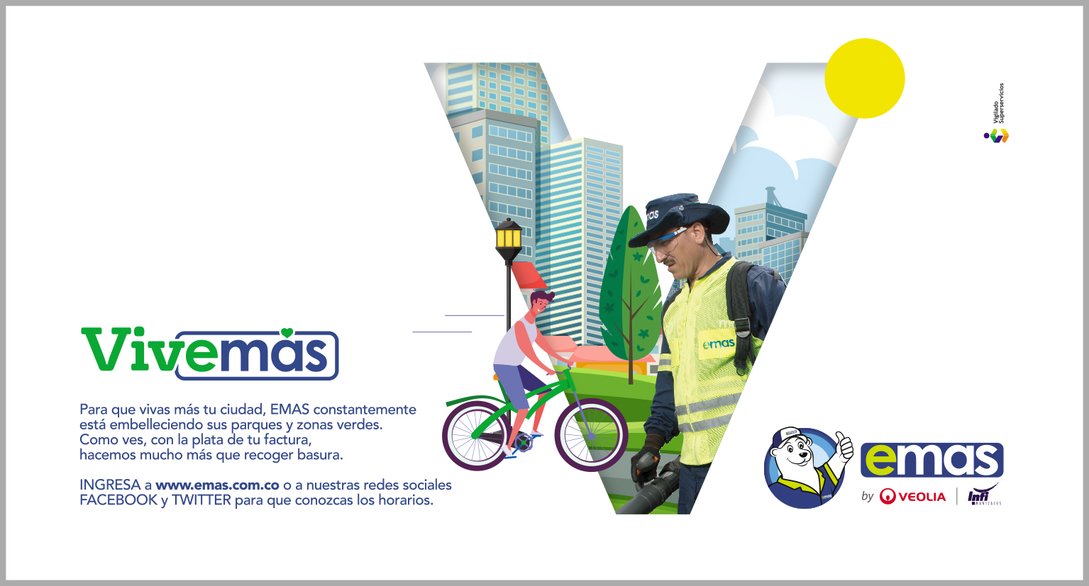 Vivemás - Para que vivas más tu ciudad, EMAS constantemente está embelleciendo sus parques y zonas verdes. Como ves, con la plata de tu factura, hacemos mucho más que recoger basura. Ingresa a www.emas.com.co o a nuestras redes sociales Facebook y Twitter para que conozcas los horarios.