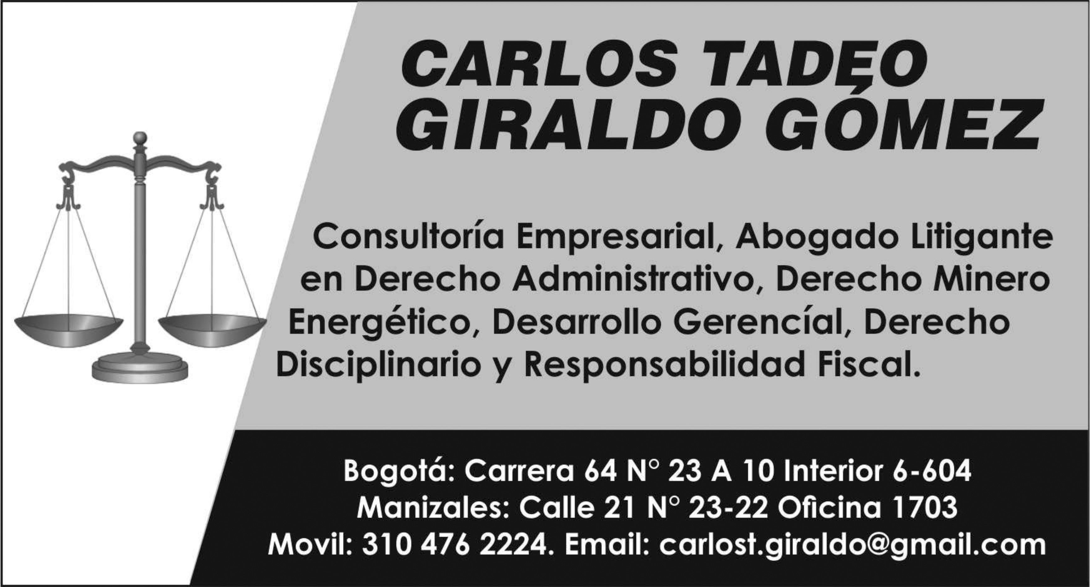 Consultoría empresarial, Abogado Litigante en Derecho Administrativo, Derecho Minero Energético, Desarrollo Gerencial, Derecho Disciplinario y Responsabilidad Fiscal. Contacto: 310 476 2224.