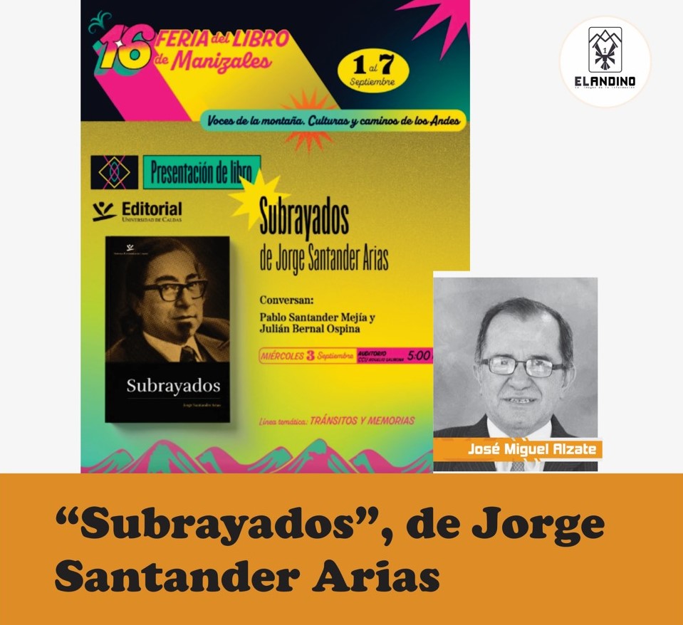 En la pasada Feria del Libro organizada por la Universidad de Caldas fue presentado el libro Subrayados, publicado por la misma alma mater caldense, donde se recogen las más importantes páginas escritas por Jorge Santander Arias, quien fuera durante varios años subdirector del diario La Patria.