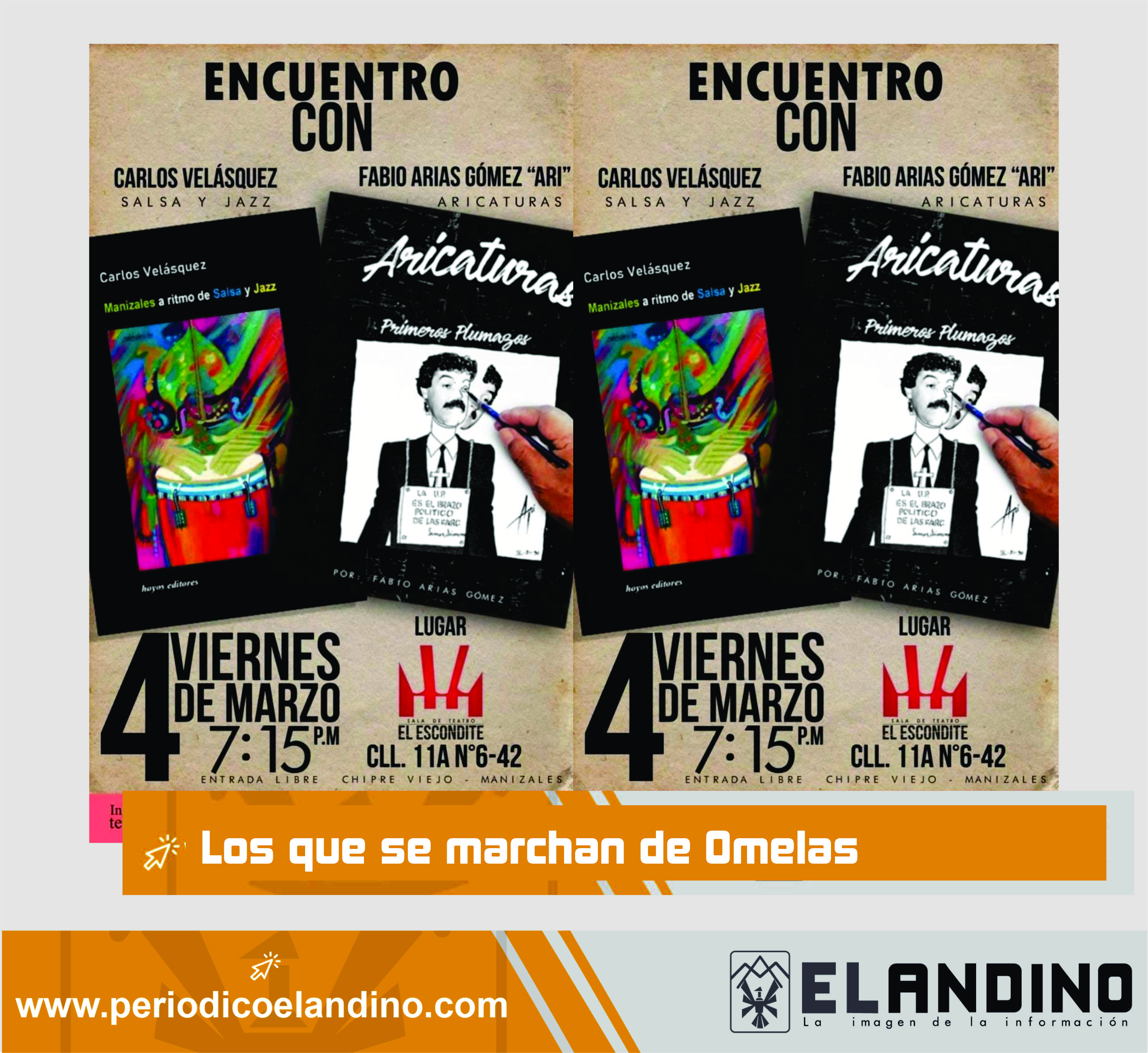 Este viernes 4 de enero a las 7:15 p.m. en el Teatro El Escondite será el encuentro, conversatorio y ventas de libros con el libro "Aricaturas, primeros plumazos" de Ari (Fabio Arias Gómez) caricaturista y director del Periódico El Andino y de Carlos Velásquez con su libro "Manizales a ritmo de Salsa y Jazz". Investigador musical. Entrada Libre.